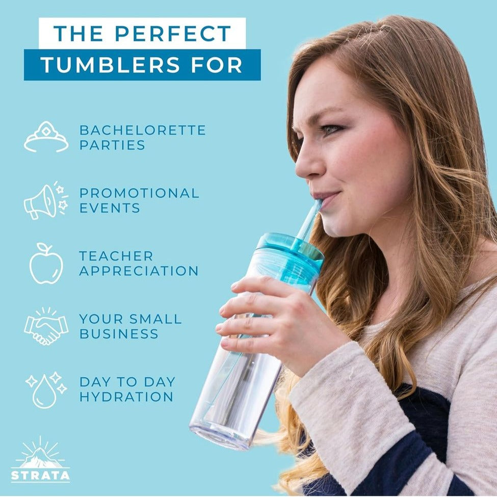💧TAMPAS À PROVA DE RESPINGOS: A maioria dos copos transparentes com tampa e palhinha vêm com uma tampa de borracha de pressão, que se solta ao cair. Os copos Strata vêm com tampas de rosca coloridas com vedação hermética por palhinha. Embora não possamos dizer que algumas gotas não escaparão, podemos garantir que não limpará uma confusão gigante de batidos do seu tapete.
