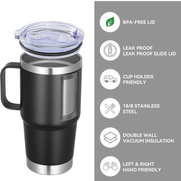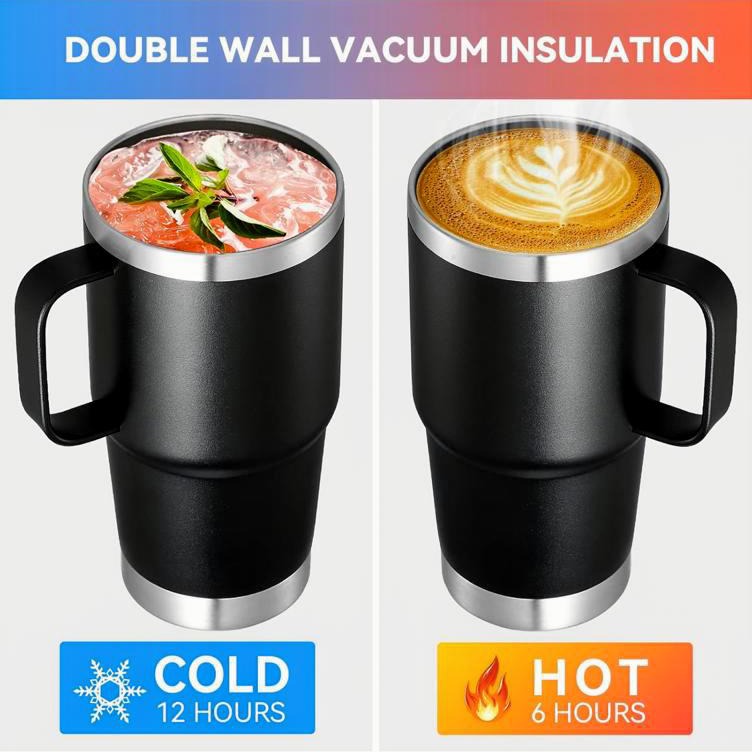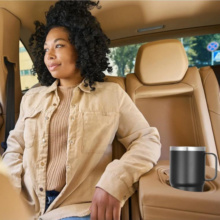 Compatível com suportes para copos: O copo de viagem para café de 591 ml tem um formato cónico que se adapta à maioria dos suportes para copos de automóvel, equipado com uma pega resistente que permite um fácil transporte. A boca larga de 8,5 cm de diâmetro facilita a limpeza da caneca de aço inoxidável.